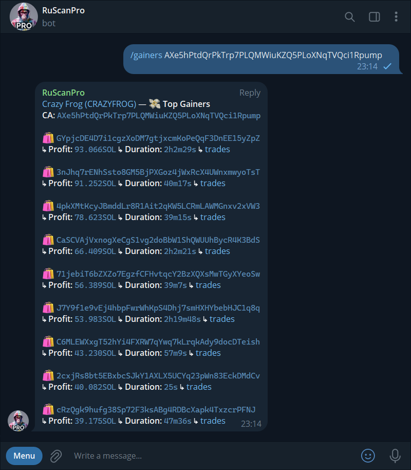 | 💸 [Top Gainers](#top-gainers) | <mark style="color:orange;">**`/gainers ca`**</mark>     |