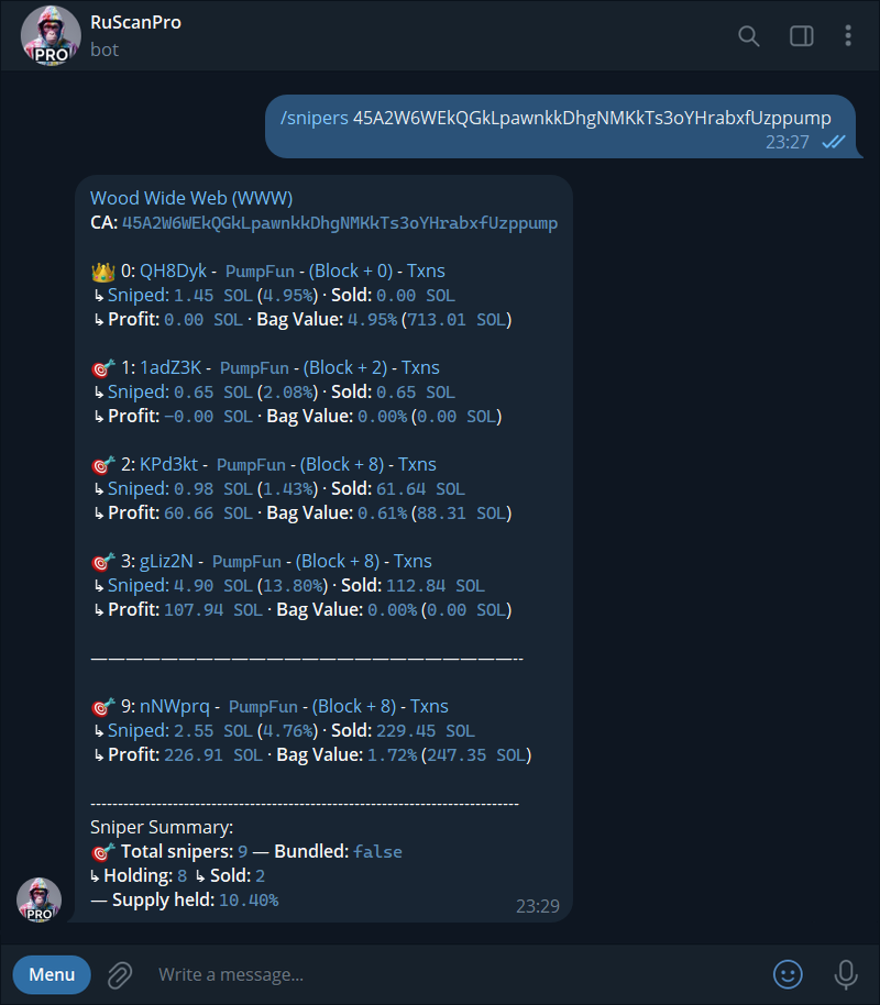 * `/snipersblock 2` → Check sniper wallets from block 2.