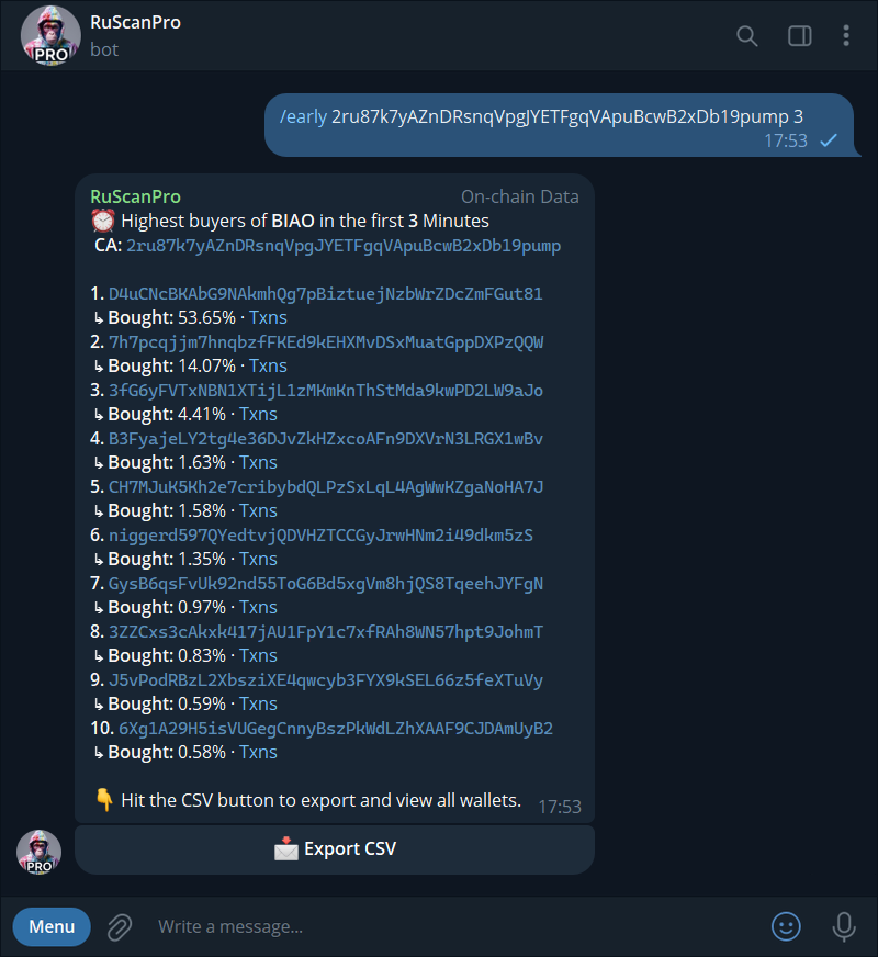 * `/early ca 5` → Get all wallets that aped within the first 5 minutes.